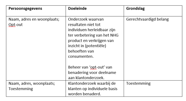 Om het product van NHG te verbeteren, en inzicht te krijgen in de behoeften van consumenten nemen wij soms contact op met een selectie personen voor een klantonderzoek. De uitkomsten van dergelijk onderzoek worden alleen op geaggregeerde wijze gerapporteerd. Dit betekent dat de resultaten op geen enkele wijze tot individuele personen zijn te herleiden. Indien wij iemand benaderen voor een dergelijk onderzoek is deelname geheel vrijblijvend.
