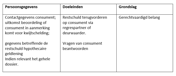 Als wij (een deel van) het verlies bij verkoop (de restschuld) aan de geldverstrekker betalen, nemen wij automatisch (een deel van) haar vordering en het hypotheekrecht over. Als blijkt dat de consument niet in aanmerking komt voor kwijtschelding, zullen wij de restschuld terugvorderen. Dit heet regres.