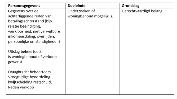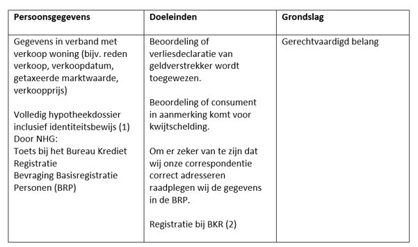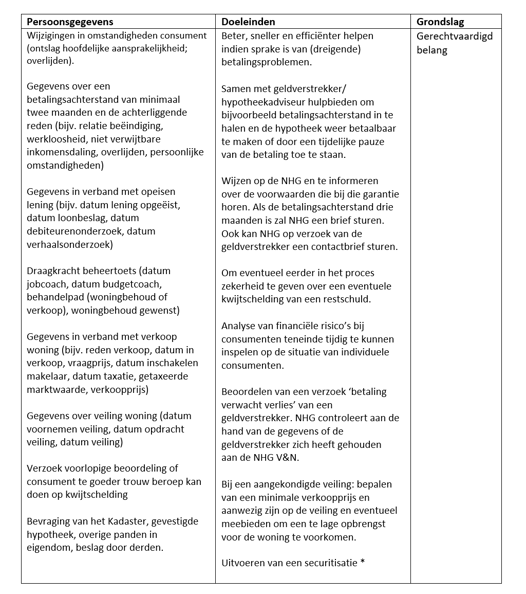In uitzonderlijke gevallen kan het zijn dat NHG een ‘Haircutovereenkomst’ sluit. Bij een Haircut doen wij een eenmalige aflossing op de hypotheek. Dat kan zo zijn als de mogelijkheden van de geldverstrekker ontoereikend zijn en er bij verkoop van de woning een verlies ontstaat. In dat geval is de wettelijke grondslag ‘de gegevens zijn noodzakelijk voor de uitvoering van de overeenkomst’.