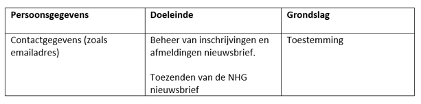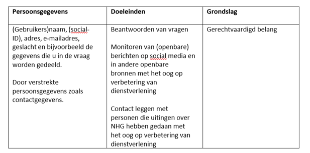 NHG is te benaderen via verschillende kanalen (zoals via de website, per e-mail, telefoon of social media) met vragen of klachten. NHG zal dan persoonsgegevens verwerken om de vraag of klacht te adresseren.