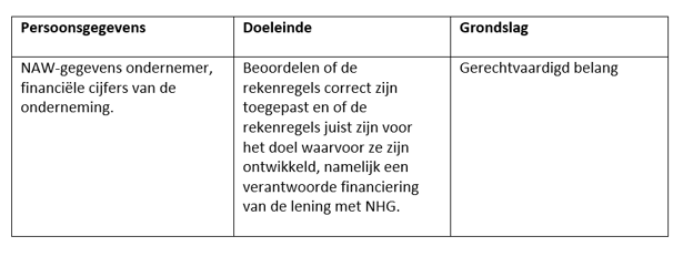 Indien de consument als ondernemer een lening met NHG af wil sluiten kan dat op basis van een inkomensverklaring. De verklaringen worden opgesteld door rekenexperts die de jaarcijfers gebruiken om het inkomen te bepalen. NHG werkt samen deze partijen. Incidenteel beoordelen we de uitgevoerde berekeningen. Hoewel de direct herleidbare persoonsgegevens daarbij niet nodig zijn, verwerken wij die impliciet.