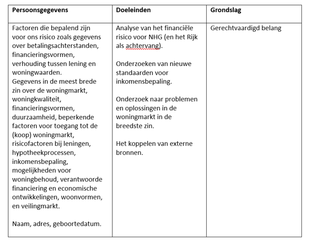 NHG doet analyses van het gebruik van haar diensten, het verloop van de processen en het bijbehorende risico voor NHG en het Rijk als achtervang. Wij doen op basis van geaggregeerde informatie statistische analyses. Dit betekent dat gegevens zoveel mogelijk worden ontdaan van direct herleidbare persoonsgegevens. De resultaten van de analyses worden uitsluitend op geaggregeerde basis gerapporteerd.