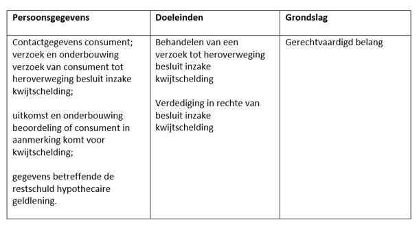 Daarnaast kan het zijn dat wij gegevens over gezondheid verwerken indien de consument bij de rechter een beroep indient tegen ons besluit over de kwijtschelding. In dat geval is onze grondslag voor de verwerking ‘verdediging in rechte’ van ons besluit inzake kwijtschelding.